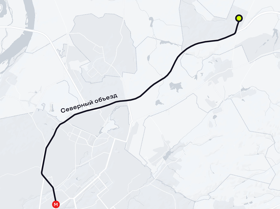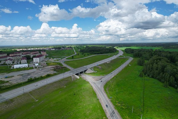 - Четырехполосная трасса с прямым съездом к дороге посёлка, первой развязкой от города