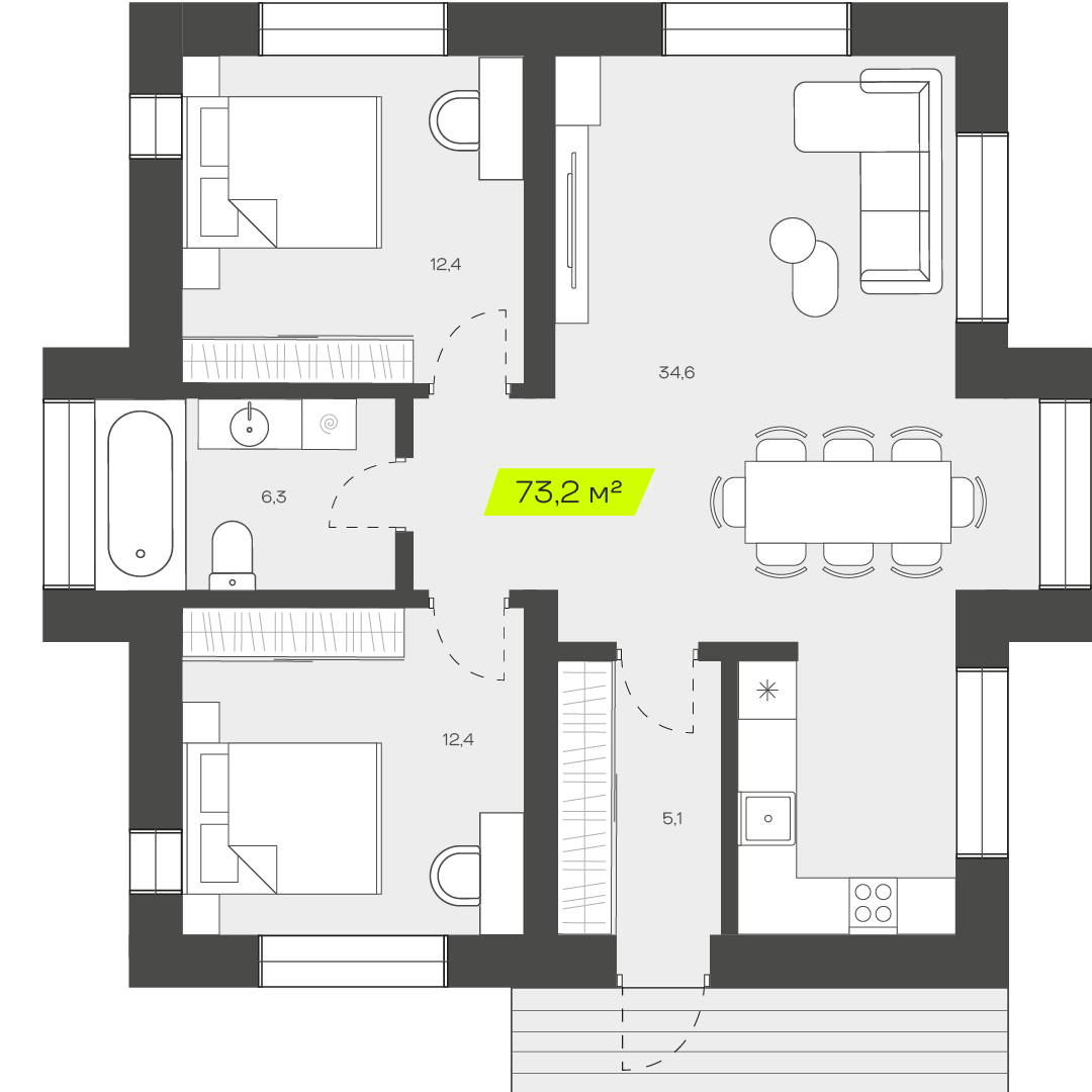 Две спальни обеспечат личным пространством семью с одним или двумя детьми, позволяя всем членам семьи комфортно проводить время дома