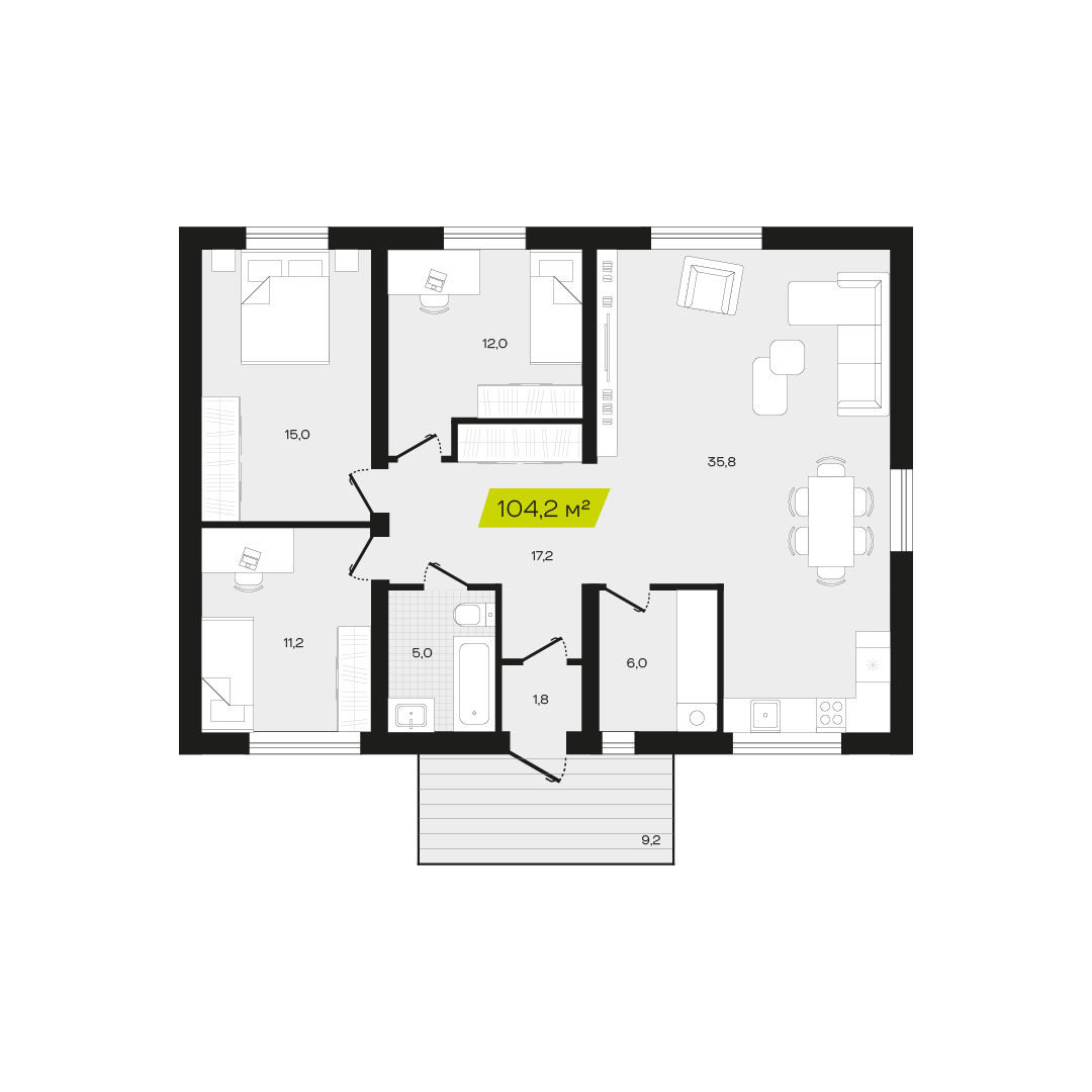 Три спальни обеспечивают достаточное пространство для семьи, позволяя каждому члену иметь собственное место для отдыха и уединения. Это особенно важно для семей с детьми, где каждый ребенок может иметь свою комнату, что способствует развитию независимости и личного пространства