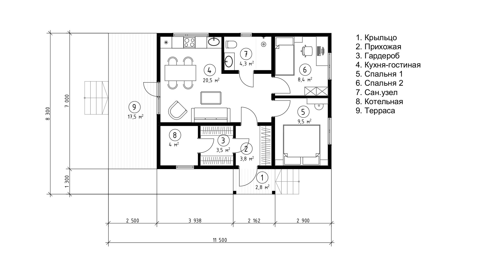 Две спальни обеспечат личным пространством семью с одним или двумя детьми, позволяя всем членам семьи комфортно проводить время дома
