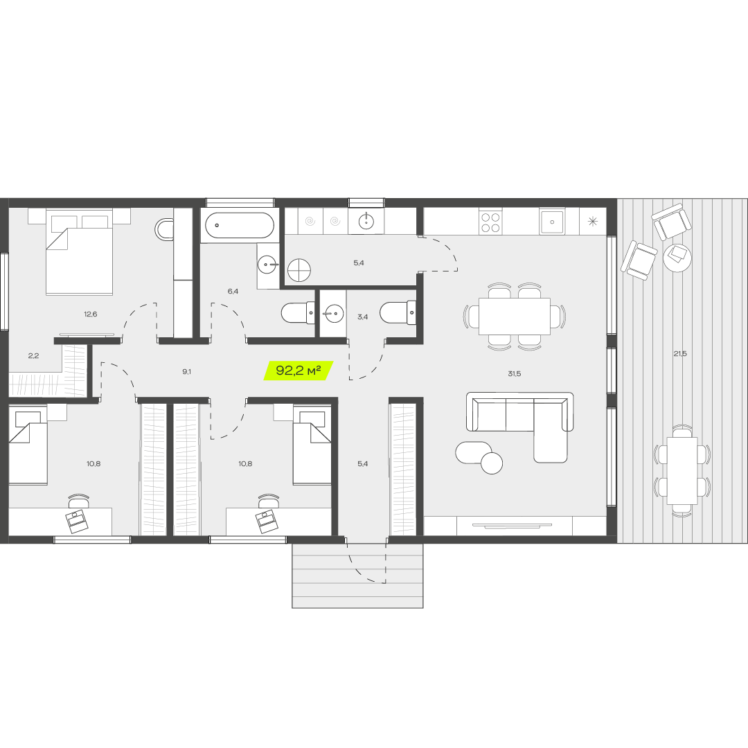 Три спальни обеспечивают достаточное пространство для семьи, позволяя каждому члену иметь собственное место для отдыха и уединения. Это особенно важно для семей с детьми, где каждый ребенок может иметь свою комнату, что способствует развитию независимости и личного пространства
