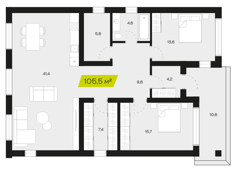 Две спальни обеспечат личным пространством семью с одним или двумя детьми, позволяя всем членам семьи комфортно проводить время дома