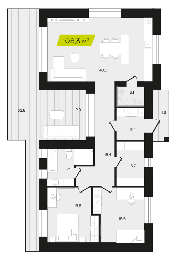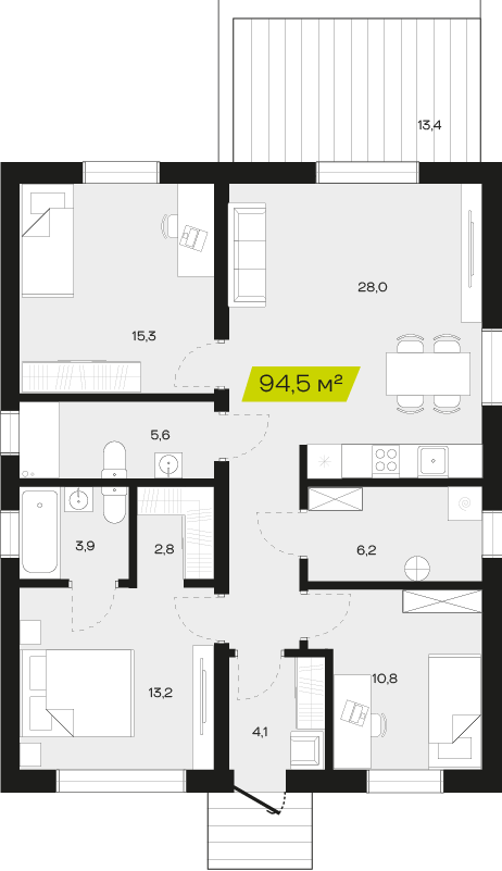 Две спальни обеспечат личным пространством семью с одним или двумя детьми, позволяя всем членам семьи комфортно проводить время дома