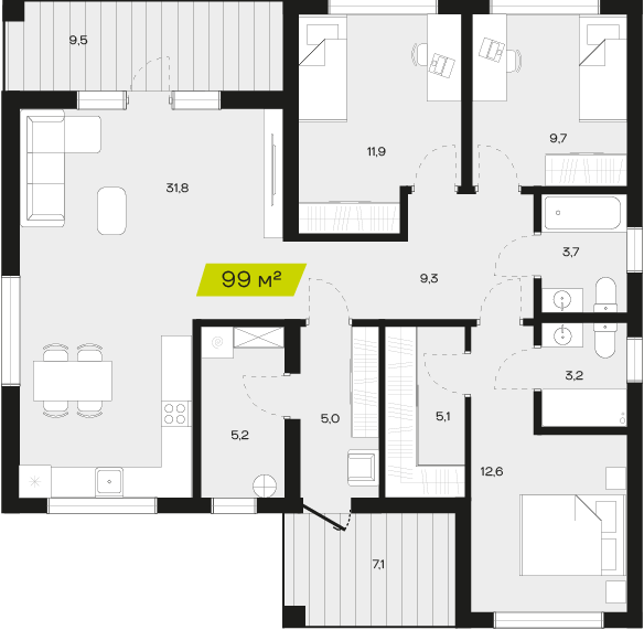 Три спальни обеспечивают достаточное пространство для семьи, позволяя каждому члену иметь собственное место для отдыха и уединения. Это особенно важно для семей с детьми, где каждый ребенок может иметь свою комнату, что способствует развитию независимости и личного пространства