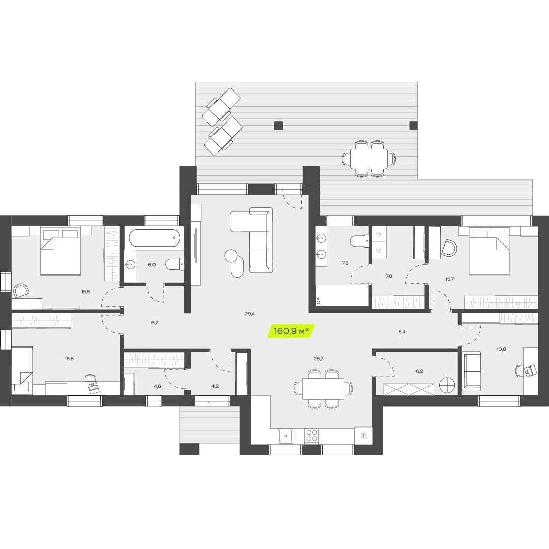 Три спальни обеспечивают достаточное пространство для семьи, позволяя каждому члену иметь собственное место для отдыха и уединения. Это особенно важно для семей с детьми, где каждый ребенок может иметь свою комнату, что способствует развитию независимости и личного пространства