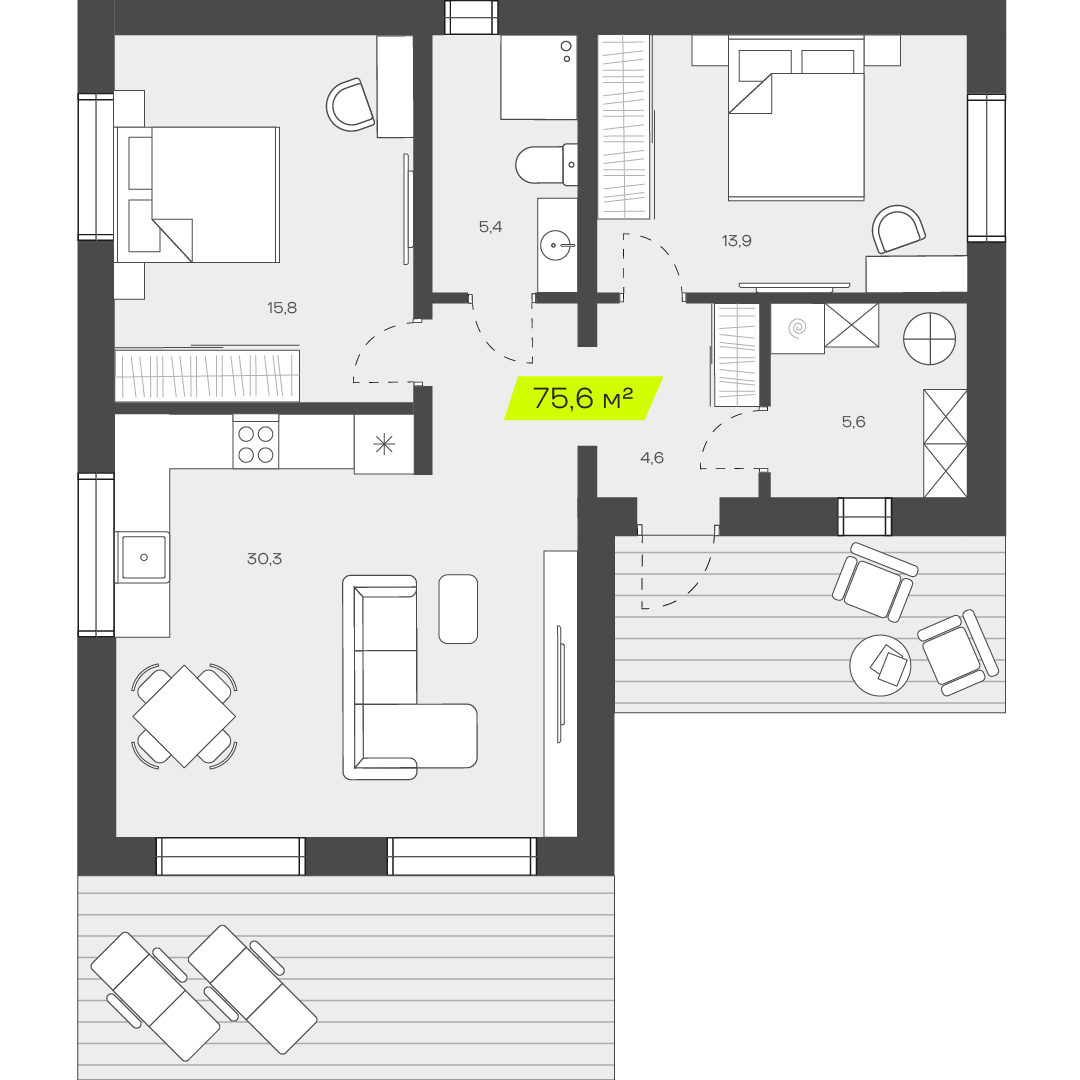 Две спальни обеспечат личным пространством семью с одним или двумя детьми, позволяя всем членам семьи комфортно проводить время дома