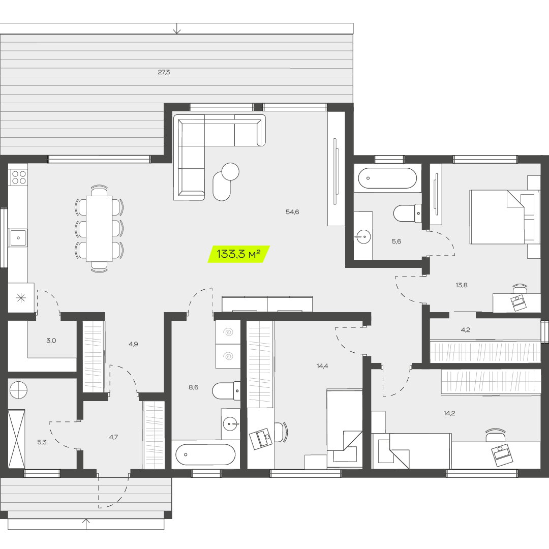 Три спальни обеспечивают достаточное пространство для семьи, позволяя каждому члену иметь собственное место для отдыха и уединения. Это особенно важно для семей с детьми, где каждый ребенок может иметь свою комнату, что способствует развитию независимости и личного пространства