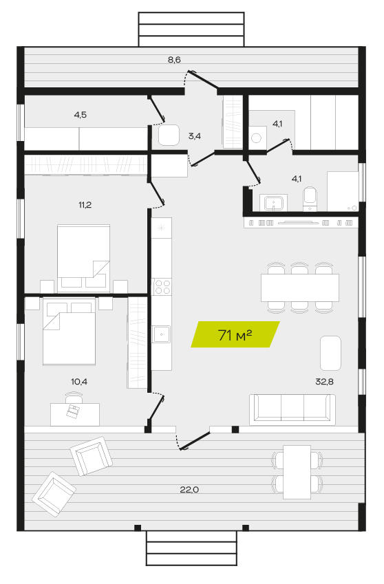 Две спальни обеспечат личным пространством семью с одним или двумя детьми, позволяя всем членам семьи комфортно проводить время дома