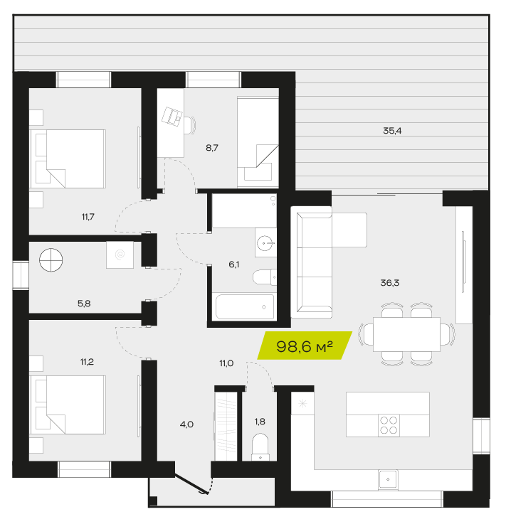 Две спальни обеспечат личным пространством семью с одним или двумя детьми, позволяя всем членам семьи комфортно проводить время дома