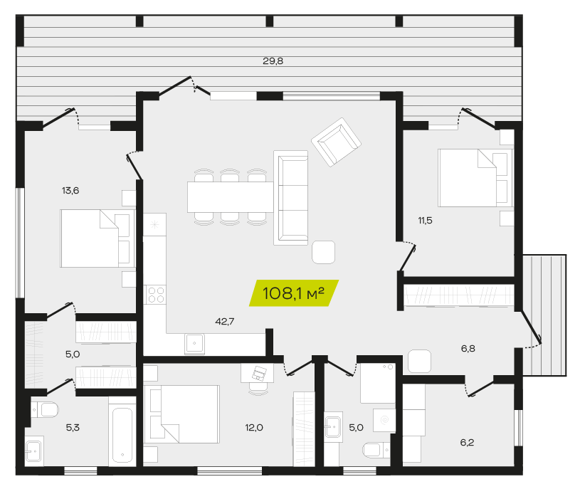 Три спальни обеспечивают достаточное пространство для семьи, позволяя каждому члену иметь собственное место для отдыха и уединения. Это особенно важно для семей с детьми, где каждый ребенок может иметь свою комнату, что способствует развитию независимости и личного пространства