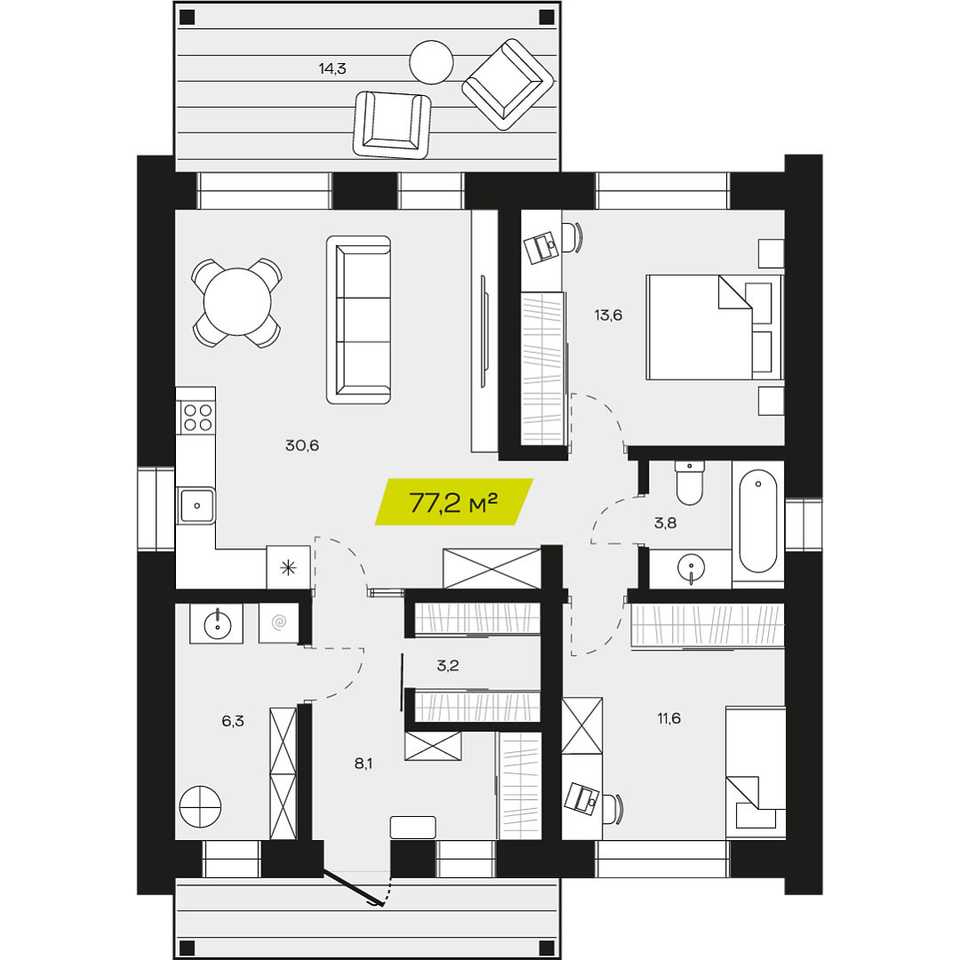 Две спальни обеспечат личным пространством семью с одним или двумя детьми, позволяя всем членам семьи комфортно проводить время дома