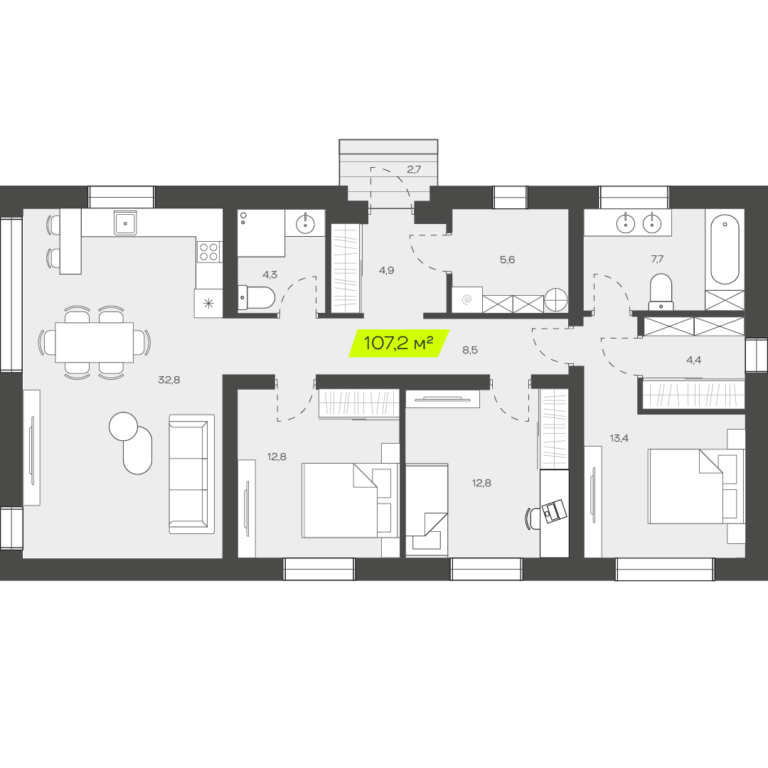 Три спальни обеспечивают достаточное пространство для семьи, позволяя каждому члену иметь собственное место для отдыха и уединения. Это особенно важно для семей с детьми, где каждый ребенок может иметь свою комнату, что способствует развитию независимости и личного пространства