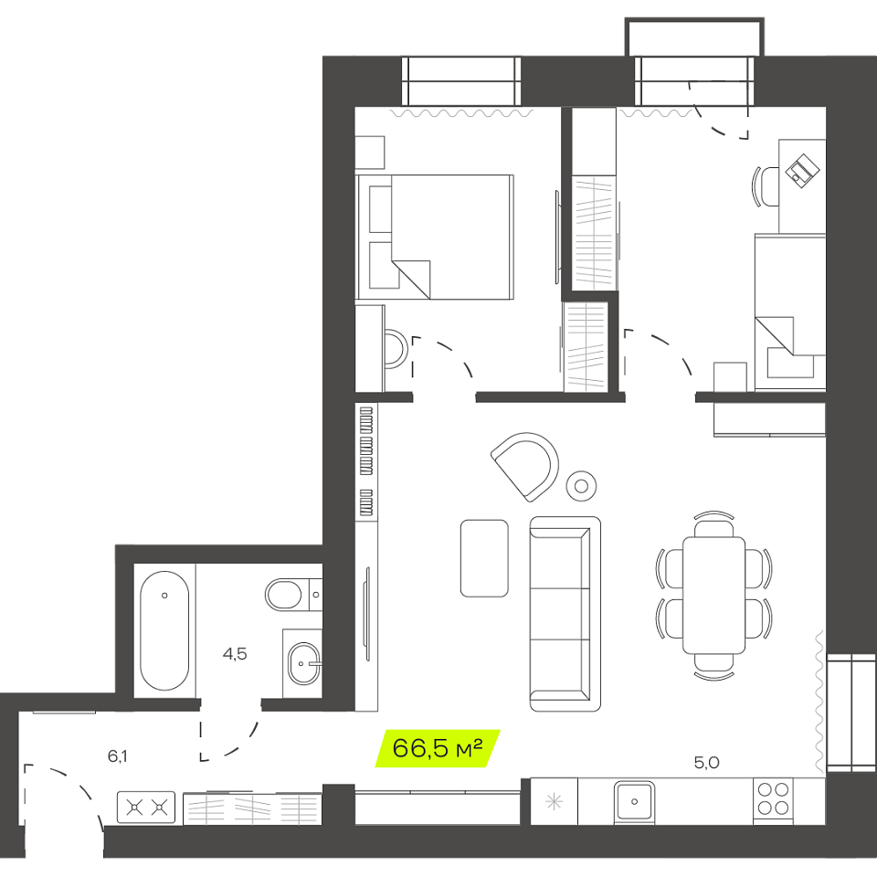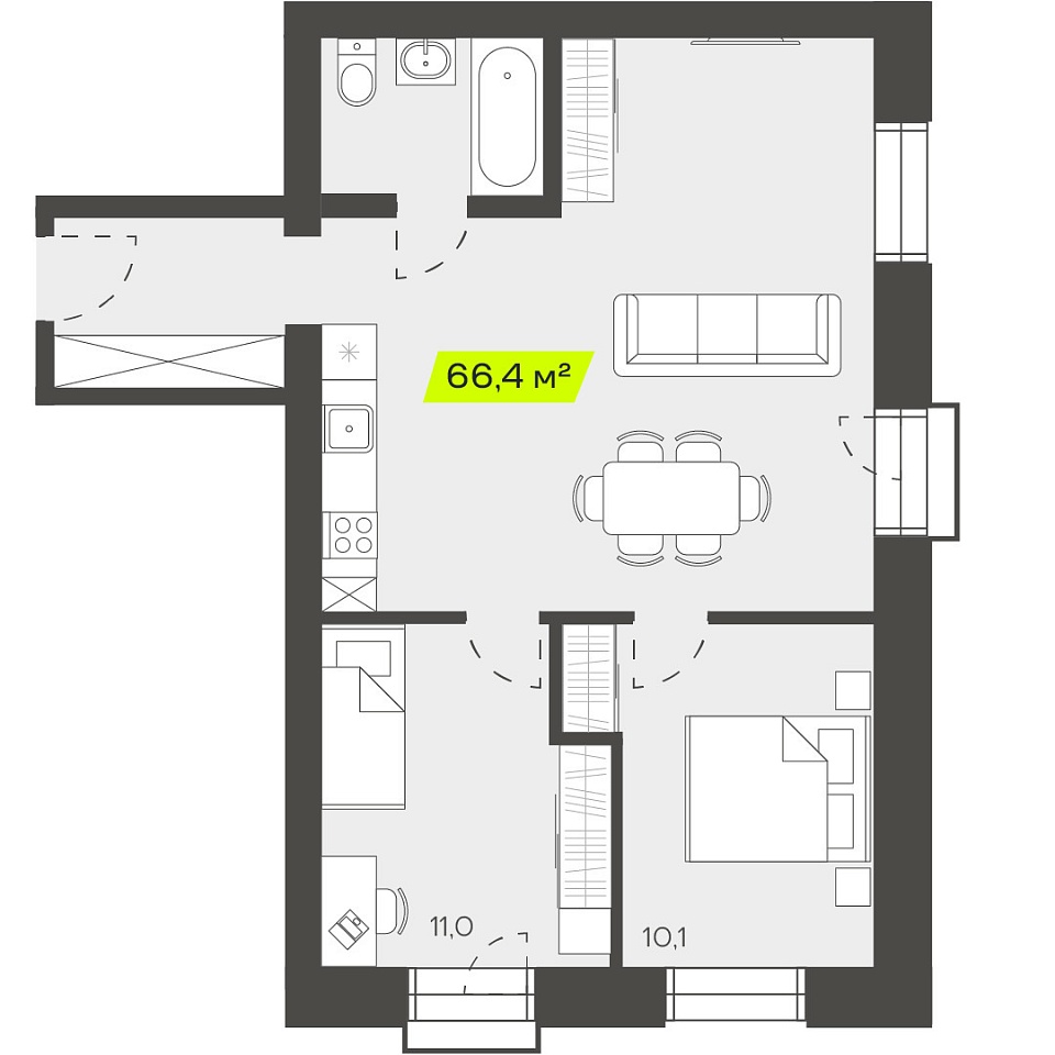 Трехкомнатная студия, 66,84м 2