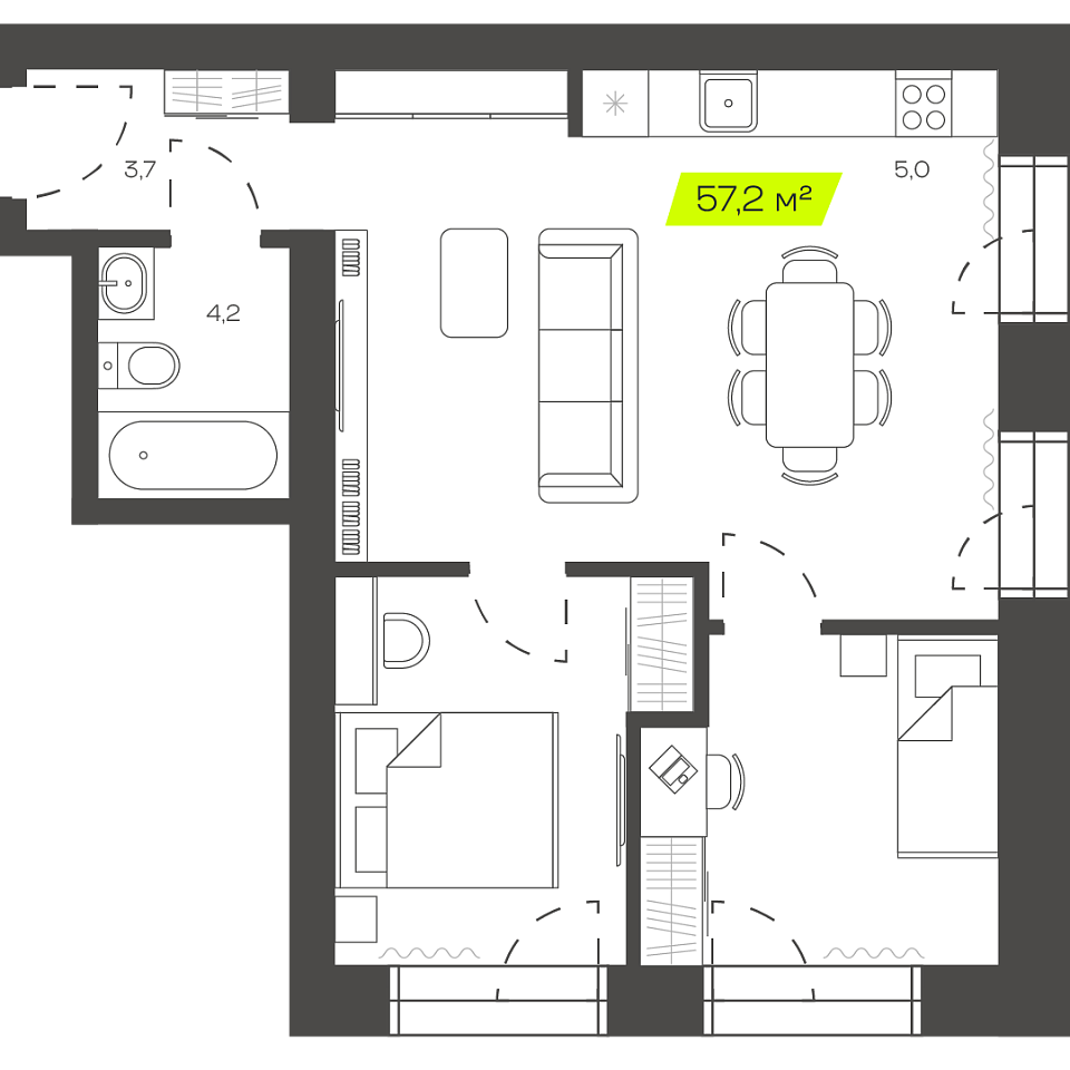 Двухкомнатная квартира, 51,42м 2